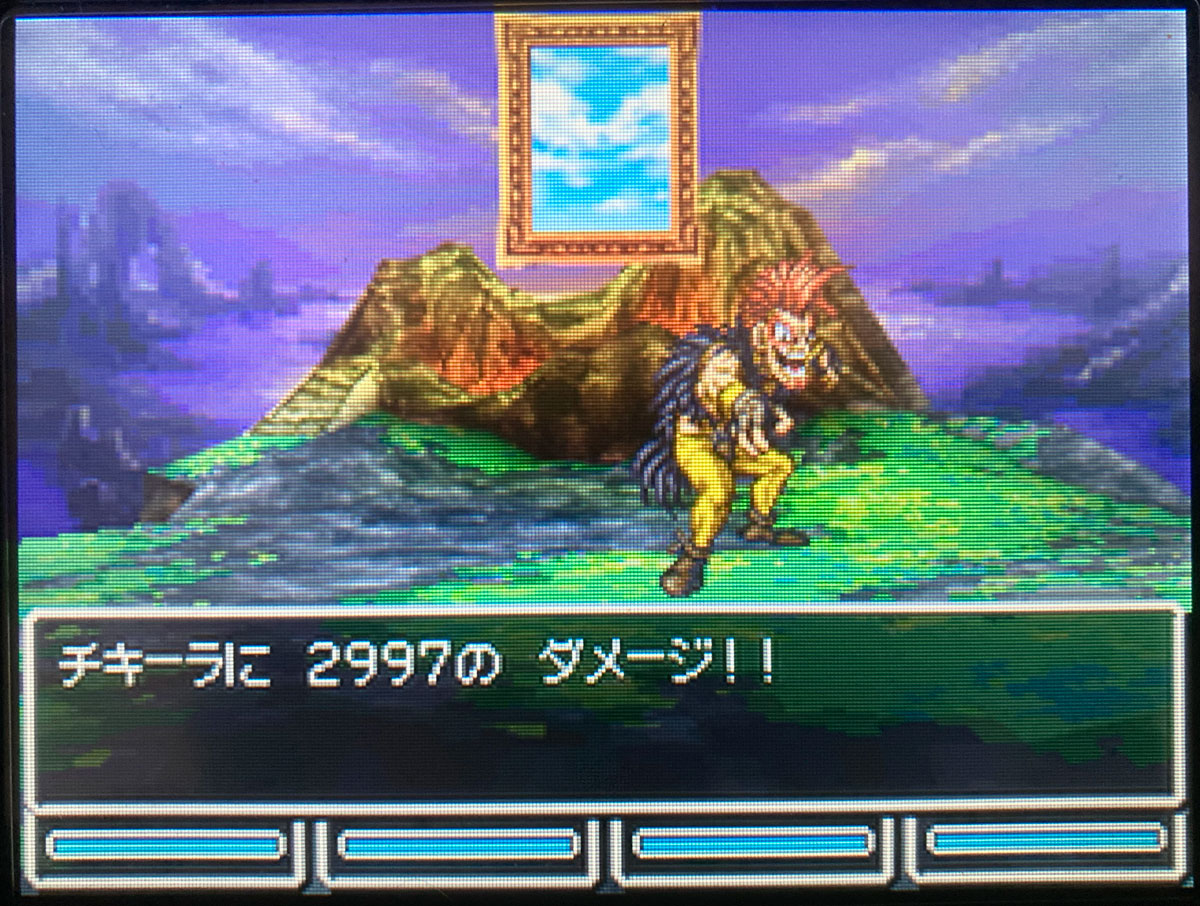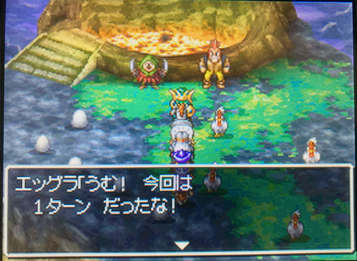 カジノと同じBGMが流れるふざけたような「エッグラ」「チキーラ」戦。ドラクエの隠しボスの中では、呪文が弱点なので比較的倒しやすいですね。MP999のピサロでマダンテ。ダメージは2997。これで1ターン撃破達成です。