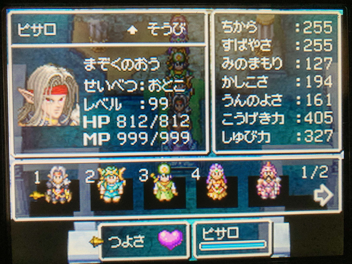それにしてもマーニャの能力値の伸びは異常ですね。キャラクター性とまるで噛み合っていません。終盤のマーニャは「ハカ」を力強く踊っていそうなイメージさえ湧いてきます。ハッサンなみのムキムキマーニャが躍るハカ。さぞかし凄絶な光景でしょうね笑。Lv.99にする奴とかどうせ少数派だし、やり込みする人のためにちょっとサプライズしてやるか、といういたずらごころを感じます。その心意気は嫌いではありません。こういうユーモアは常にあってほしいところ。
